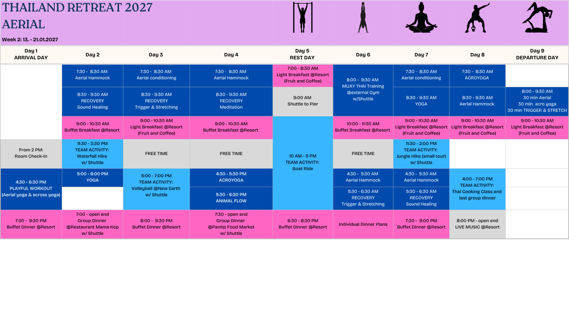 - Inklusive: Unterkunft, fast alle Mahlzeiten, alle Kurse und Gruppenaktivitäten